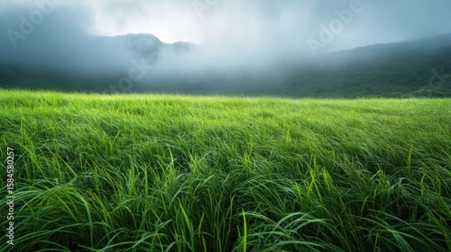 Lush green grass sways gently in a field, creating a serene landscape with mountains shrouded in mist in the distance, evoking a sense of tranquility and natural beauty.