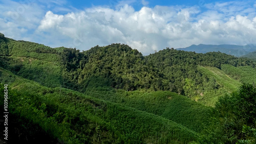 Lush green hills under a blue sky in Nagaland, India, symbolize serenity and nature's beauty, related to ecotourism and conservation