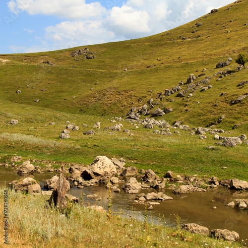 Lush green hills with rocky outcrops and a tranquil stream flowing through the valley during a sunny afternoon