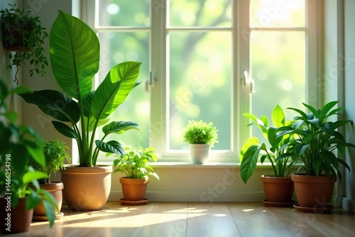 Lush green indoor plants thriving in a sunlit room , home gardening, interior, jungle room