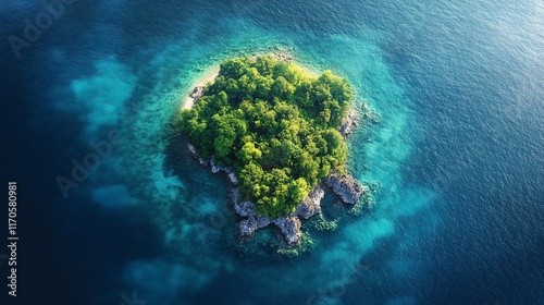 island, ocean, sea, water, blue, green, tropical, lush, vegetation, tree, foliage, coast, shoreline, rocky, cliff, coral, reef, turquoise, aerial, view, overhead, perspective, nature, landscape, paradise, exotic, secluded, remote, pristine, untouched, calm, serene, tranquil, peaceful, beautiful, scenic, stunning, breathtaking, vibrant, clear, bright, sunlight, summer, escape, get-away