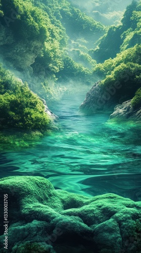 nature, landscape, water, river, stream, green, turquoise, foliage, tree, forest, rock, stone, moss, mist, fog, scenic, serene, tranquil, peaceful, environment, wilderness, vale, canyon, depth, clarity, light, sunlight, texture, abstract, art, illustration, vibrant, bright, colours, natural, beauty, view, composition, detail, design, scene, calm, surface, underwater, flow, aquatic, earth