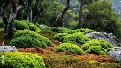 landscape, nature, green, tree, boulder, shrub, plant, foliage, vegetation, scenic, view, environment, flora, lush, vibrant, colourful, rock, stone, hillside, mountain, forest, timberland, wild, natural, beauty, serene, peaceful, tranquil, calm, texture, pattern, background, image, photo, picture, photo, artistic, visual, art, design