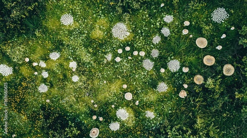 green, landscape, mushroom, wildflower, nature, aerial, flora, biodiversity, meadow, growth, organic, ecology, vegetation, summer, scenery, plant, texture, environment, sunlight, vibrant, bloom, habitat, rural, natural, freshness, lush, field, garden, wild, earth, season, decoration, peaceful, beauty, harmony, ecological, tranquil, rural scene, natural beauty