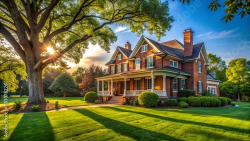 house, brick house, porch, tree, lawn, home, architecture, real estate, exterior, building, residential, property, landscape, garden, nature, summer, sunlight, candid, photo, suburban, rural, front yard, yard, grass, leaf, daytime, brick, greengrass