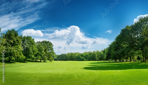 lush green lawn with trees and blue sky and white clouds on a bright sunny day