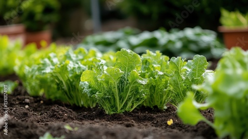 Lush green leafy vegetables growing in a garden bed.