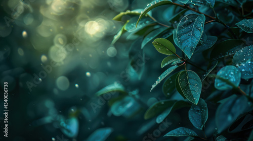Lush green leaves glistening with water droplets, creating serene atmosphere