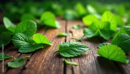 lush green leaves scattered on a wooden floor, foliage, green, outdoors