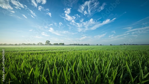 Lush green meadow landscape in the morning, clear sky with few clouds, wide angle,natural,sky,grass