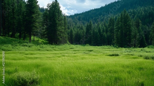 Lush green meadow surrounded by tall trees under a cloudy sky in a mountainous area : Generative AI