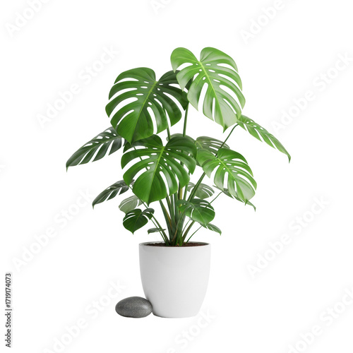 Lush green Monstera Deliciosa plant, fenestrated leaves, in a matte white pot, dark gray river stone, on a transparent background, 45-degree view. Modern elegance concept