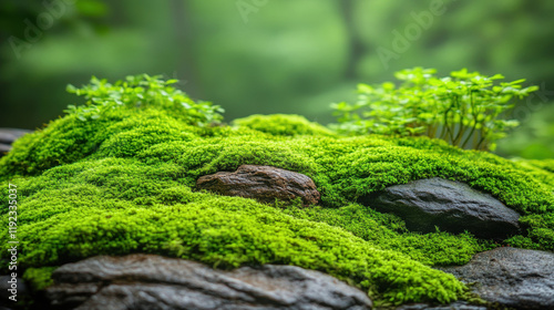 Lush green moss and stones in serene natural forest setting