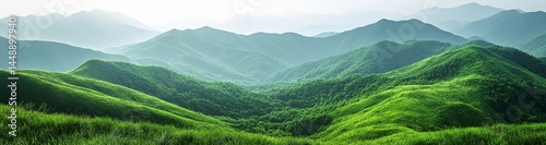 Lush Green Mountainside Landscape with Dense Vegetation Hilly Terrain and Light Mist in Tropical Environment with Panoramic View on an Overcast Day