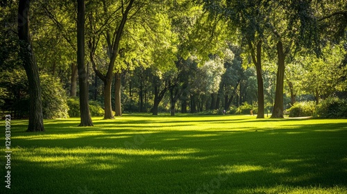 park, tree, sunlight, canopy, green, nature, landscape, grass, foliage, outdoors, tranquil, serene, peaceful, natural, environment, scenic, summer, daytime, shadow, lush, vibrant, timberland, leaf, shade, growth, earth, oxygen, calmness, fresh, atmosphere, ecosystem, parkland, recreational, afternoon, sunny, beautiful, verdant, illuminated, grassy, open, relaxation, ecology