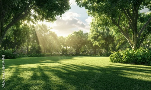 Lush green park with tall trees casting dappled sunlight on the grass, creating a serene and tranquil outdoor atmosphere