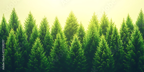 Lush green pine trees stand tall against a soft diffused golden light evoking a tranquil forest scene.