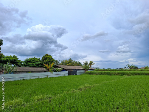 Lush green rice paddy field next to a rural farm building with trees under a cloudy blue sky. Scenic tropical agricultural landscape. Perfect background for farming, rural life, and nature concepts