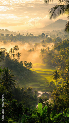 Lush green rice terraces bathed in golden sunrise light on a misty morning