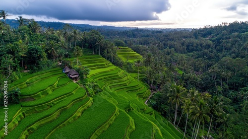 Lush Green Rice Terraces in Bali Under Dramatic Sky with Surrounding Tropical Landscape