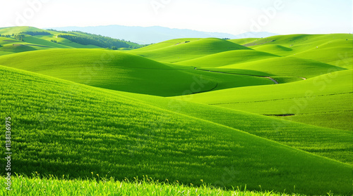 Lush green rolling hills under a clear sky, distant blue mountains visible, vibrant greenery fills the foreground, nature concept. Ai generative