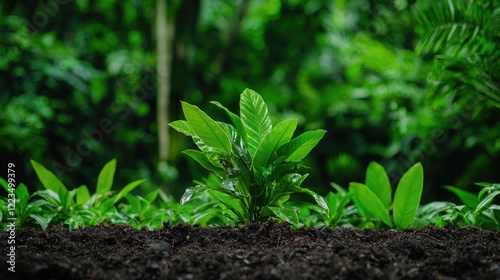 Lush green sapling growing in rich soil, vibrant jungle backdrop; environmental conservation