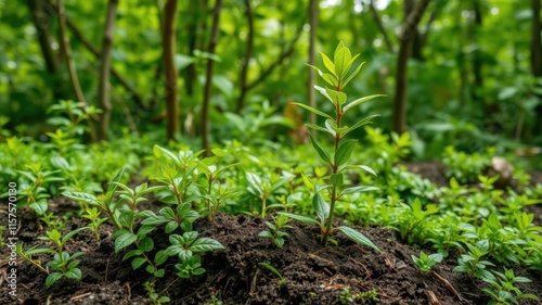 Lush Green Seedlings Emerging from Rich Soil in a Vibrant Forest Environment, Symbolizing Growth, Renewal, and Nature’s Resilience in a Sunlit Woodland