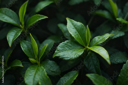 tea leaf, green, tea plant, moody, dark, atmospheric, closeup, macro, texture, foliage, nature, botany, garden, plantation, tropical, growth, fresh, organic, healthy, herbal, drink, beverage, raw material, natural light, low key, detail, soft focus, background, wallpaper, abstract, pattern, food and drink, agriculture, farming, cultivation, environment, serenity, wellness, caffeine, vibrant