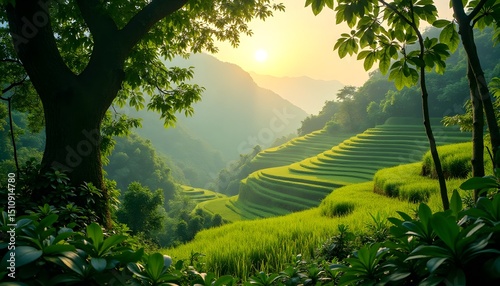 Lush Green Terraced Rice Fields Under Sunset Sunlight in Mountain Valley