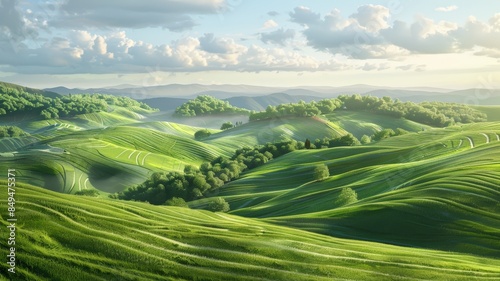 nature, landscape, green, hill, meadow, countryside, serene, sky, cloud, scenic, field, pastoral, vale, sunlit, lush, vegetation, tree, rolling, gentle, slope, undulating, distant, mountain, beauty, harmonious, bright, expansive, flowing, rural, clear, tranquil, terrace, picturesque, idylli, peaceful, sun, horizon