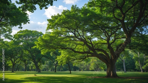 Lush green tree canopy on a sunny day showcasing vibrant foliage and serene park landscape ideal for nature and outdoor themes.