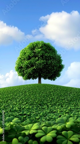 Lush Green Tree on Hill with Clover Field Under Blue Sky and Clouds Serene Nature Landscape