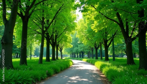 Lush green trees and winding paths in urban nature park, city, paths, greenery