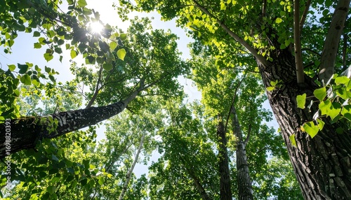tree, green, sky, sunlight, leaf, branch, forest, canopy, nature, outdoors, lush, bright, dense, vertical, upward, view, summer, spring, growth, life, natural, fresh, healthy, vigorous, forestry, environment, ecology, photo, beauty, light, peace, tranquil