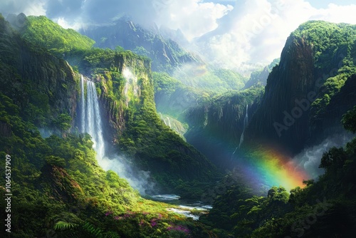 waterfall, vale, green, lush, rainforest, mountain, jungle, nature, forest, foliage, tropical, scenic, landscape, cloud, sky, mist, fog, river, water, rock, cliff, stream, cascade, rainbow, vibrant, high-coloured, beauty, calmness, serenity, wonder, awe, breathtaking, paradise, escape, harmony, wild, wilderness, pristine, untouched, remote, secluded, adventure, exploration