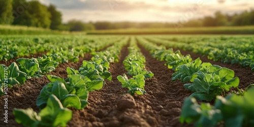 Lush Green Vegetable Crop Growing in a Sunny Field at Sunset
