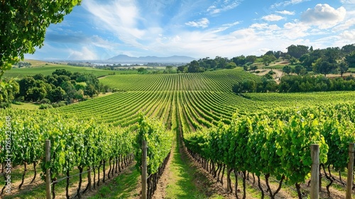 Lush Green Vineyard Landscape with Rows of Grape Vines Under a Blue Sky and Scenic Mountains in the Background