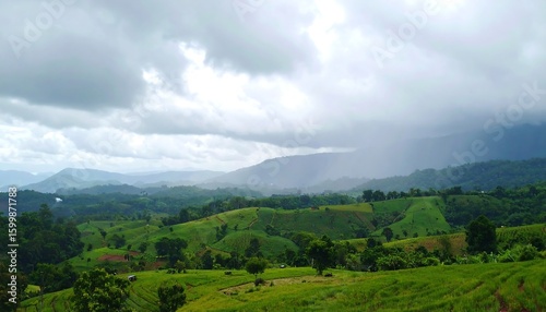 hill, cloudy, sky, green, rain, landscape, vale, mountain, lush, nature, rural, vibrant, peaceful, misty, rolling, forest, vegetation, elevation, countryside, scenic, view
