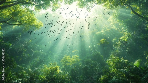 Lush jungle canopy, sunlight filtering through trees, bats flying