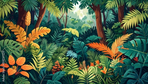 Lush jungle foliage in vivid hues