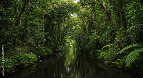 jungle, river, waterway, forest, canopy, lush, green, vibrant, nature, serene, tranquil, dark, deep, water, tree, foliage, plant, fern, vegetation, dense, tropical, natural, landscape, path, travel, exploration, calm, peaceful, moody, high-coloured, detailed, photo, environmental, biodiversity, eco, mirrored, scenic, beauty