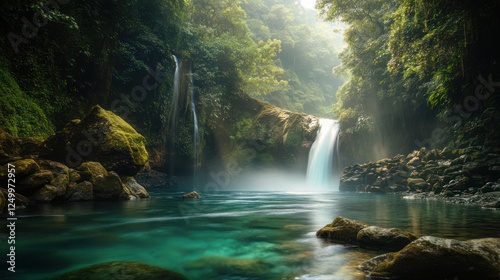 Lush jungle waterfall pool, sunlight rays, tranquil scene, nature photography, travel