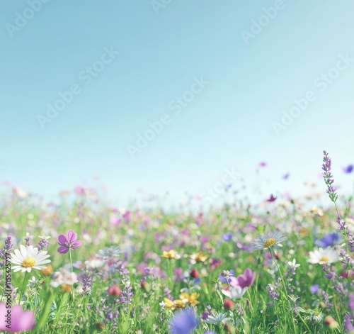 Lush Meadow Blooming with Colorful Wildflowers Under a Bright Blue Sky Captivating Spring Landscape with Delicate Petals and Natural Beauty