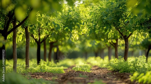 fruit farm, tree, sunlight, row, spring, nature, green, leaf, plant, agriculture, farming, garden, landscape, background, environment, botany, ecology, growth, rural, scenic, summer, field, crop, sunshine, light, healthy, fresh, vibrant, natural, organic, beautiful, peaceful, serenity, calmness, idylli, country, farm, plantation, dirtied, earth, wood, leaf, plant
