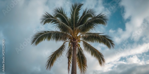 Lush palm tree silhouette against a dramatic cloudy sky with ample blank space for text or branding elements.