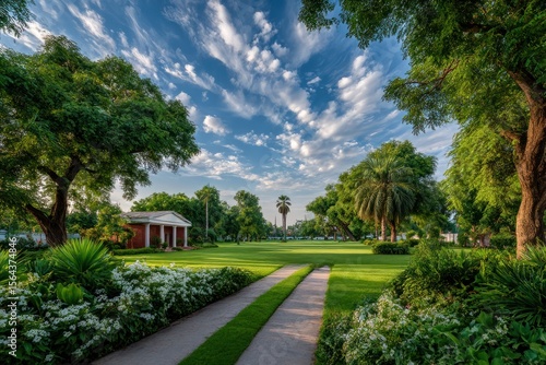 park, pathway, tree, cloud, lawn, sky, green, flower, building, sunlight, lush, garden, peaceful, scenic, tranquil, summer, nature, beautiful, view, morning, landscape