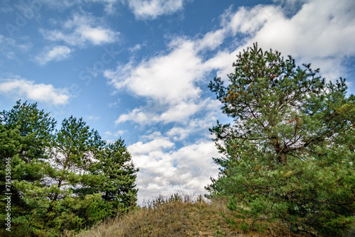Lush pine trees on both sides, growing on a yellow hill, against a backdrop of blue sky with white clouds