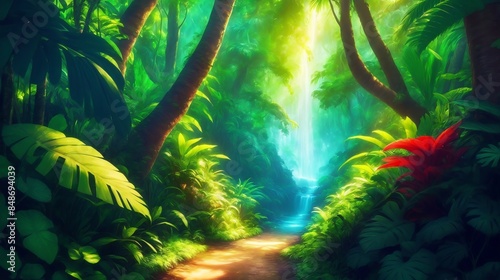Lush rainforest landscape with vibrant foliage and a serene waterfall, perfect for nature and adventure-themed projects