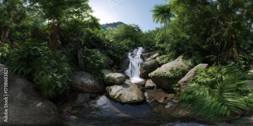Lush rainforest waterfall hdri panoramic view in nature serene environment with vibrant greenery