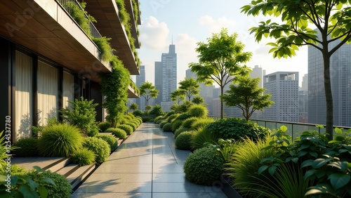 Lush rooftop garden with manicured greenery, modern architecture, and city skyline